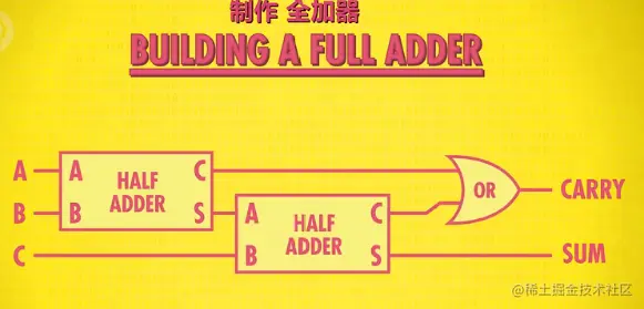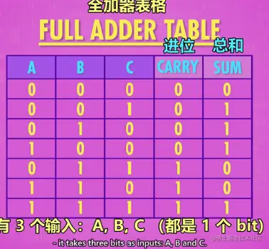 刚刚提起到进位:下一位计算的时候要把上一位的进位加上,上面只是完成了一个比特的加法(不需要处理进位输入的加法),如果有多位需要进行运算这时候就需要多一个输入进位了。这种需要进行三个输入的加法器叫做全加器用于计算进位的。