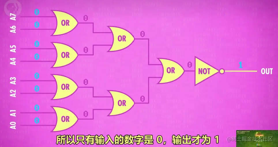 通过OR门只要有一个1最后的输出就是0false因为该数字中有一个bit是1