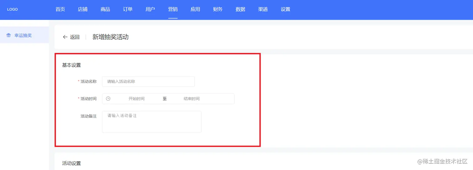 来到幸运抽奖页面,点击”新增幸运抽奖“,输入活动名称、活动时间、活动备注,等基本信息,这里活动备注可以省略不写