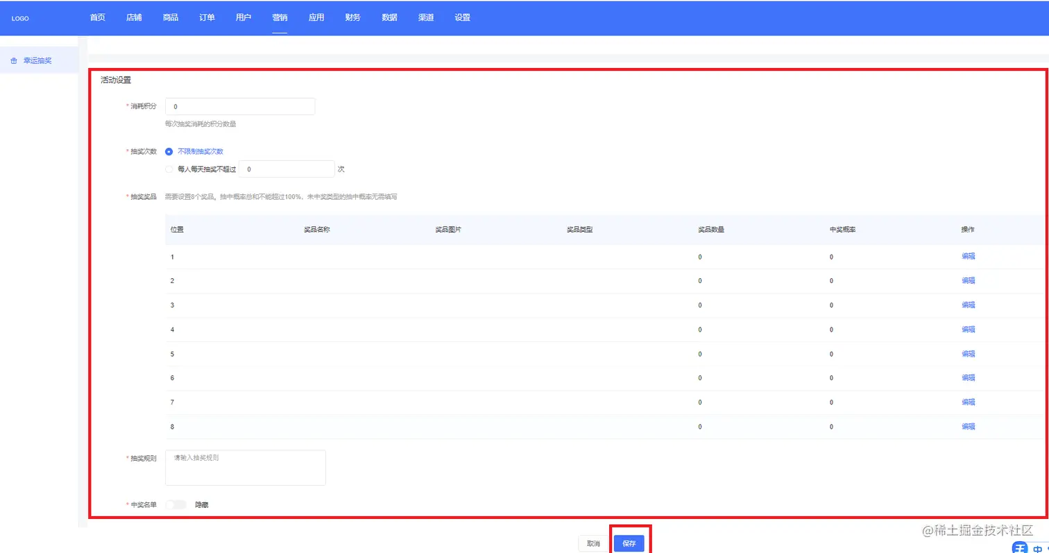输入每次抽奖消耗的积分数量、每个用户的抽奖次数、抽奖的奖品(注意这里需要设置8个奖品,抽中概率总和不能超过100%,未中奖类型的抽中概率无需填写)、设置抽奖规则、设置中奖名单是否能被其他用户看到,设置完后点”保存“