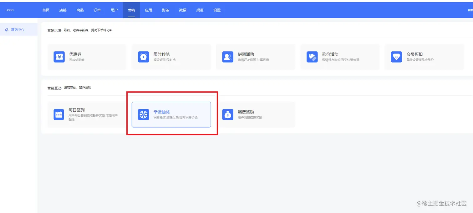 来到我们管理后台的首页,点击营销,点击幸运抽奖