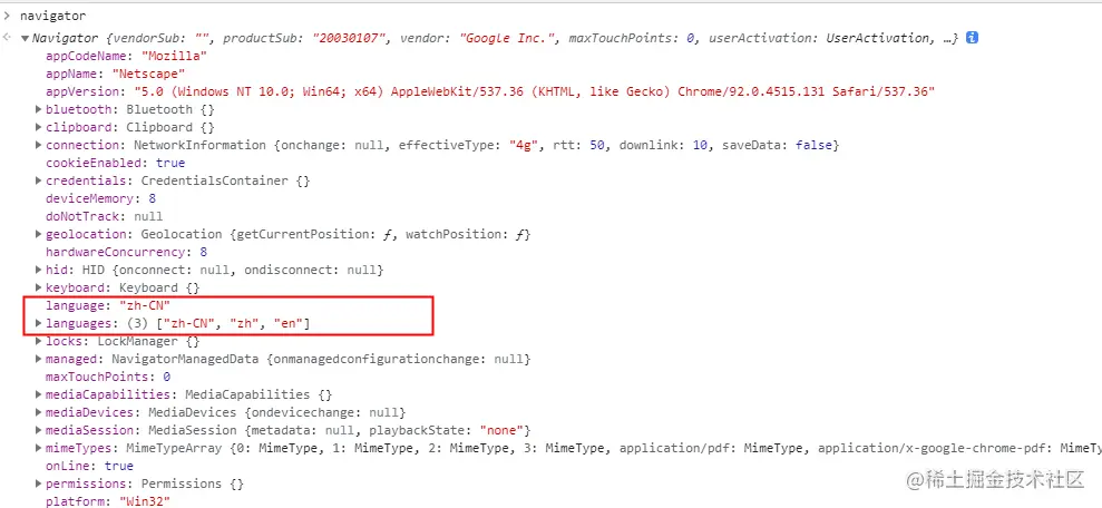 其中,navigator.language和navigator.languages 两个属性中 包含了浏览器的相关语言信息:
