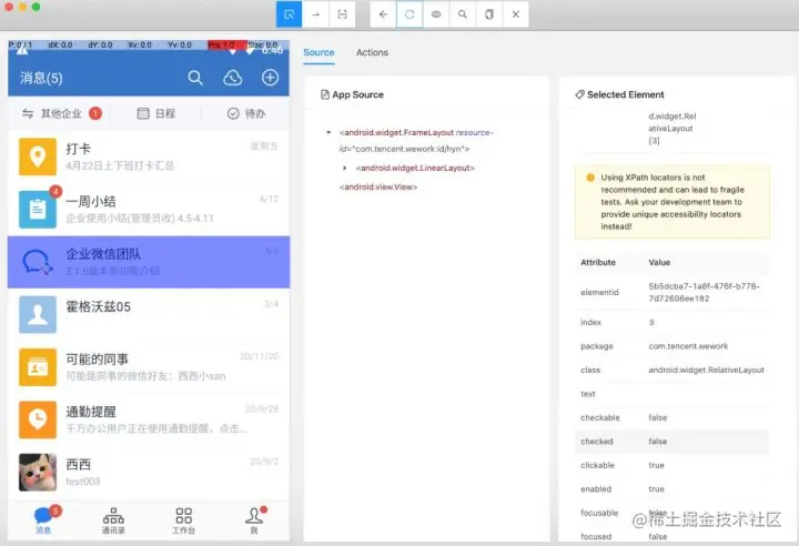 中间为页面 DOM 树结构:在应用层次结构中会直接将元素的属性值标记在树上,这对于 Appium 定位元素很方便。