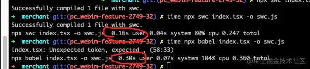 time npx swc[babel] xx.tsx -o after.js