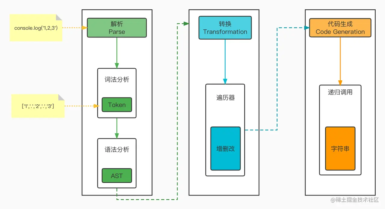 - 代码生成:将处理后的新的语法树(AST)-> 新的代码(字符)