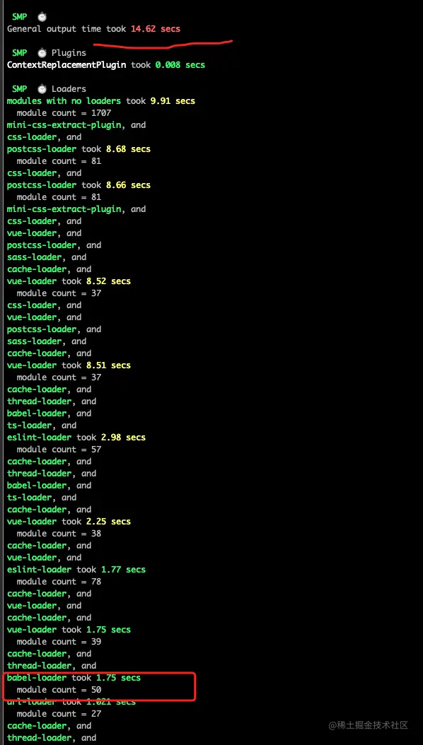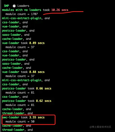 build后的耗时如下,由于没有设置swc配套的插件和预设,结果却是 swc-loader 更耗时。