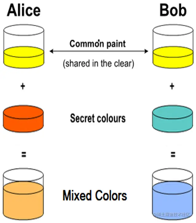 DH秘钥交换协议 与“通过混合颜色交换密钥”的概念非常相似,具有很好的视觉表现,简化了其理解。 这就是为什么我们首先要解释如何通过混色来交换秘密颜色。