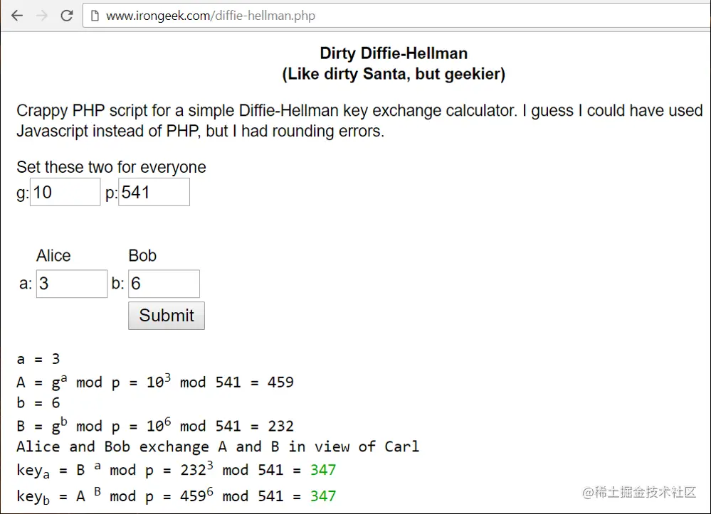 如果我们有 A = ga mod p 和 B = gb mod p,我们可以计算 gab mod p,不显示 a 或 b(称为 秘密指数)。
