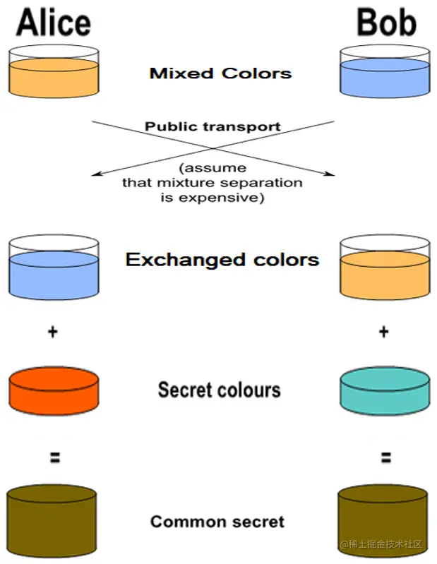 - Alice 和 Bob 分别选择他们自己保留的秘密颜色(例如 red 和 sea green)。