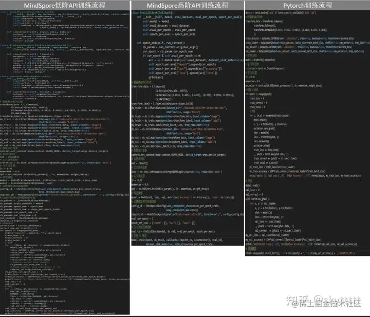 下图展示了MindSpore高阶API、低阶API和PyTorch的训练流程的区别。\