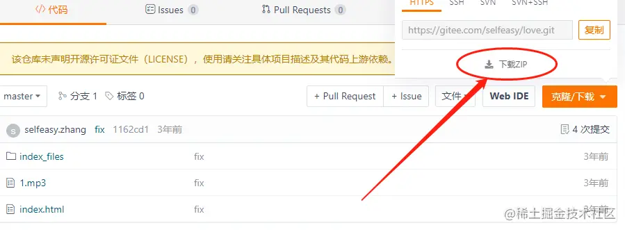 我们找到一个开源网页作为内容,放到我们的web station里。这里使用的模板地址为“gitee.com/selfeasy/lo…”,我们以zip格式,将其下载到本地电脑上。