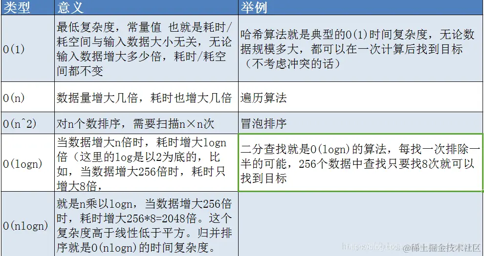 多项式阶:随着数据规模的增长,算法的执行时间和空间占用,按照多项式的比例增长。包括, O(1)(常数阶)、O(logn)(对数阶)、O(n)(线性阶)、O(nlogn)(线性对数阶)、O(n^2)(平方阶)、O(n^3)(立方阶) 非多项式阶:随着数据规模的增长,算法的执行时间和空间占用暴增,这类算法性能极差。包括, O(2^n)(指数阶)、O(n!)(阶乘阶)