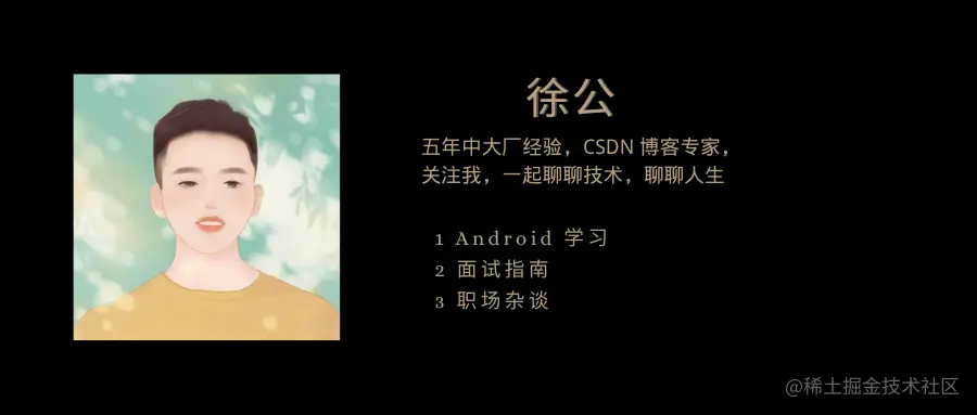 本文首发我的微信公众号徐公,收录于 Github·AndroidGuide,这里有 Android 进阶成长知识体系, 希望我们能够一起学习进步,关注公众号徐公,5 年中大厂程序员,一起建立核心竞争力