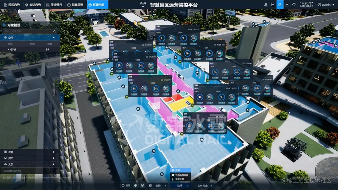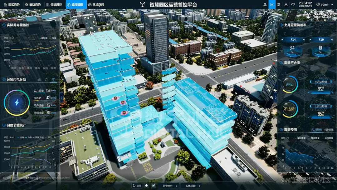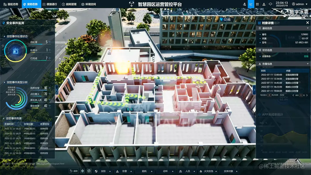 系统基于数字孪生技术,构建实景三维园区,对园区全景、全要素态势进行精细化复现;集成园区各类资产、IoT智能设备、AI、业务系统等多类型数据资源,涵盖园区态势、安防态势、便捷通行、能耗管理、环境空间等业务子系统,提供数据分析、对象管理、建筑剖分、设备控制、实时告警管理、虚拟漫游等丰富功能,实现园区各业务领域的智能化运营管理。