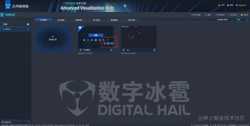 导入租户资产——页面缩略图悬浮新增导入租户资产功能,将选中的页面导入到租户资产下的页面列表中,供其他项目或本项目使用。
