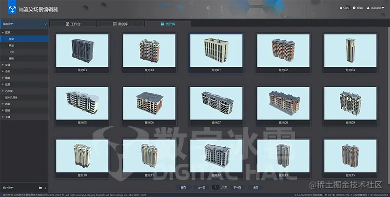 资产库管理——支持系统资产与租户资产,系统资产增加800多种模型资产,可作为配置场景的素材资源拖拽到场景中使用。
