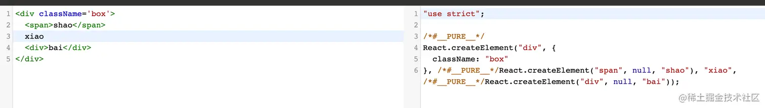 通过官网的 babejs 在线转换 ,我们可以看到一个一个标签都转化为了 React.createElement 方法。