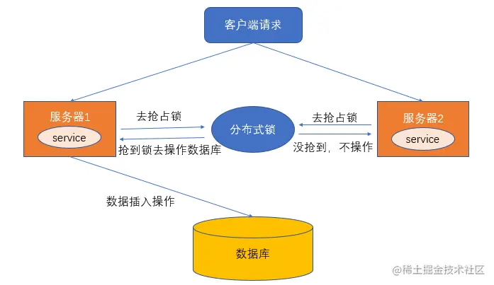 比如说在一个分布式系统中,多台机器上部署了多个服务,当客户端一个用户发起一个数据插入请求时,如果没有分布式锁机制保证,那么那多台机器上的多个服务可能进行并发插入操作,导致数据重复插入,对于某些不允许有多余数据的业务来说,这就会造成问题。而分布式锁机制就是为了解决类似这类问题,保证多个服务之间互斥的访问共享资源,如果一个服务抢占了分布式锁,其他服务没获取到锁,就不进行后续操作。大致意思如下图所示(不一定准确):