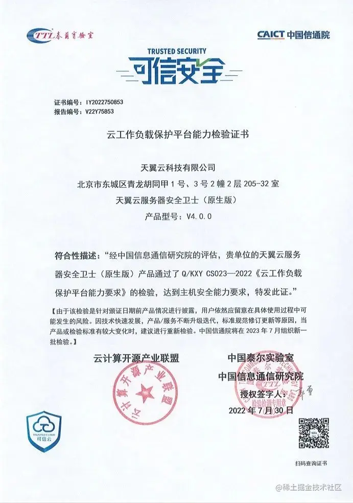 近日,由中国信息通信研究院与中国通信标准化协会联合主办的“安全运营发展论坛”召开,会上公布了2022可信云安全首批云工作负载保护平台评估结果,天翼云服务器安全卫士(原生版)顺利通过认证,天翼云成为首批四家通过认证的企业之一。