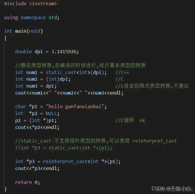 静态类型转换,编译的时候 c++编译器会做类型检查。 基本类型能够转换,但是不能转换指针。可实现C++中内置基本数据类型之间的相互转换(int,struct,enum,char...)。不能进行无关类型指针之间的转换。【无关类型:非基类与派生类之间,也就是说可以进行基类与子类之间的类型转换,但是不建议使用,不安全。编译阶段进行的,它可以是基类转成子类,显然这样是不行的】