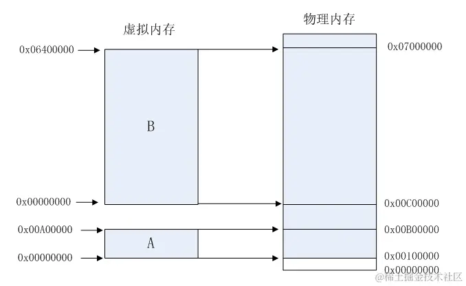 假设有两个进程A和B,进程A所需内存大小为10M,其虚拟地址空间分布在0x00000000到0x00A00000,进程B所需内存为100M,其虚拟地址空间分布为0x00000000到0x06400000。那么按照分段的映射方法,进程A在物理内存上映射区域为0x00100000到0x00B00000,,进程B在物理内存上映射区域为0x00C00000到0x07000000。于是进程A和进程B分别被映射到了不同的内存区间,彼此互不重叠,实现了地址隔离。