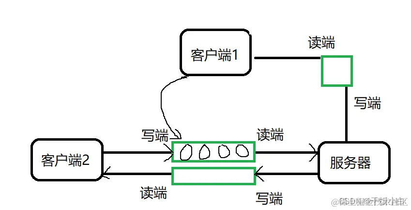 管道设计:管道是半双工通信的,所以我们向两端相互通信的情况下,最好是设计两个管道,由于客户端向服务器端发送数据的时候,服务器端是统一个的,而且管道是队列结构的,所以所以客户端可以向同一个管道中写数据,服务器从这个管道中依次读数据就行。但是服务器向客户端端发送数据的时候,可能把数据发给A或者发给B,所以每一个客户端都有一个中间的管道。