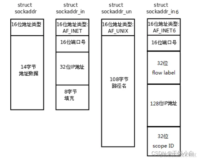 很多网络编程函数诞生早于IPv4协议(用自定义的协议咯,双方共同约定一个规则),那时候都是使用struck socketaddr结构体,为了向前兼容,现在在socketaddr退化成了 (void *)的作用,传递一个地址给函数,至于这个函数是sockaddr_in还是sockaddr_in6,由地址族确定,然后函数内部再强制类型转化为所需的地址类型。