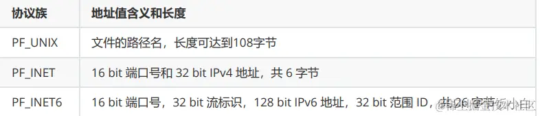 sa_family成员是地址族类型(sa_family_t)的变量。地址族类型通常与协议类型对应。常见的协议族和对应的地址族如下所示: