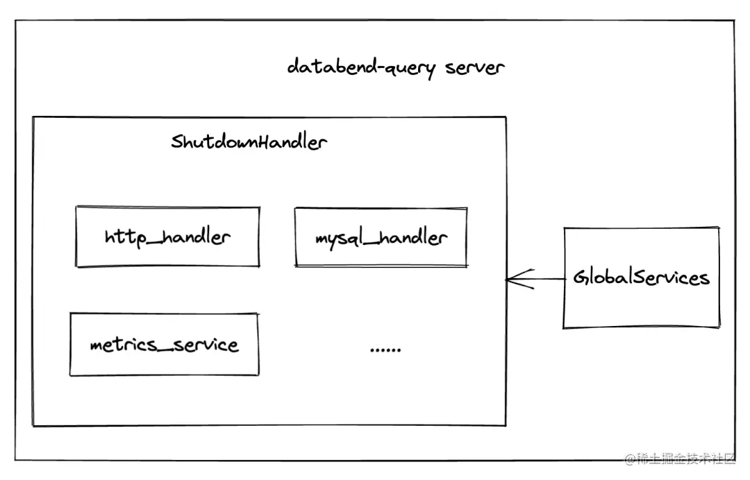 Databend-query server 的启动入口在 databend/src/binaries/query/main.rs 下,在初始化配置之后,它会创建一个 GlobalServices 和 server 关闭时负责处理 shutdown 逻辑的 shutdown_handle
