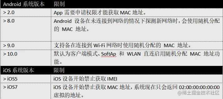 比如iOS 5以上版本开始禁止获取IMEI,iOS 7 以上版本禁止获取MAC 地址。而Android 版本则从2.0版本开始App 需要申请权限才能获取MAC 地址。