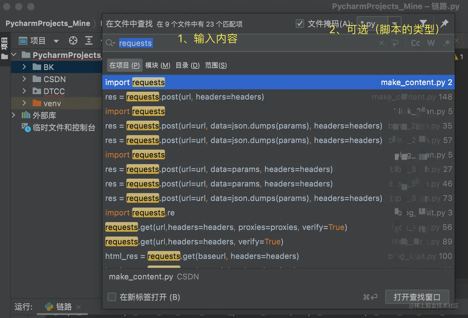PyCharm的FindinPath功能提供了全局查找功能,快捷键: