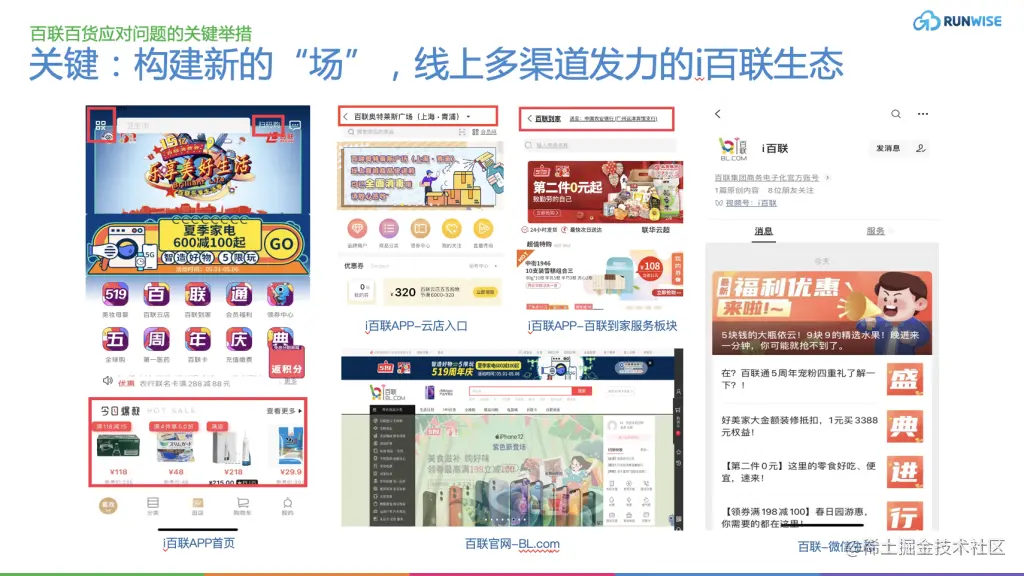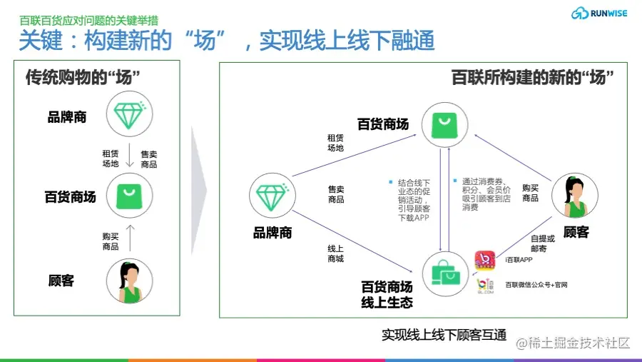 Runwise团队认为,百联集团这种联通线上线下的举措,不仅增加了消费者触点,还能够使集团主动出击,通过构建起来的会员体系实现全域营销,从而增加营业额和消费者复购率。 比如,百联集团可以通过APP,微信生态主动向会员发送大促信息,优惠券等福利,而不用被动等待顾客来逛商场。毕竟很多时候,顾客的需求是被刺激出来的。