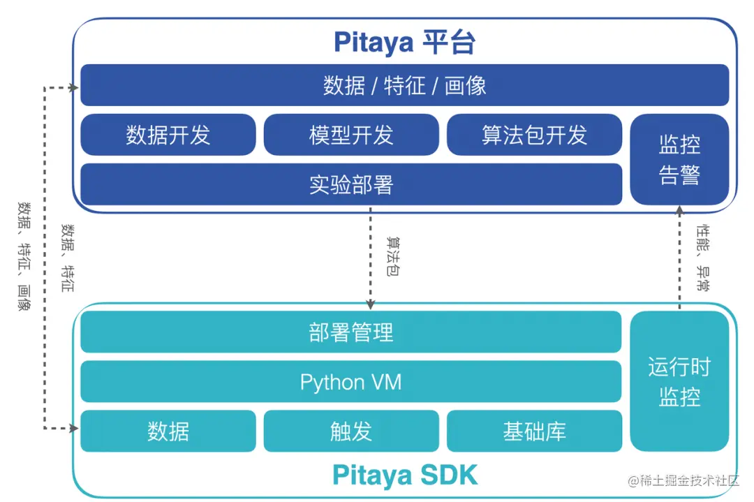 - Pitaya 平台为端上AI提供了工程管理、数据接入、模型开发、算法开发和算法包部署管理等一系列的框架能力。在端上算法策略开发过程中,Pitaya 平台支持在AB平台对端智能算法策略进行实验,验证算法策略的效果。除此之外,Pitaya 平台还支持对端上AI的效果进行实时的监控和告警配置,并在看板上进行多维度的分析与展示。