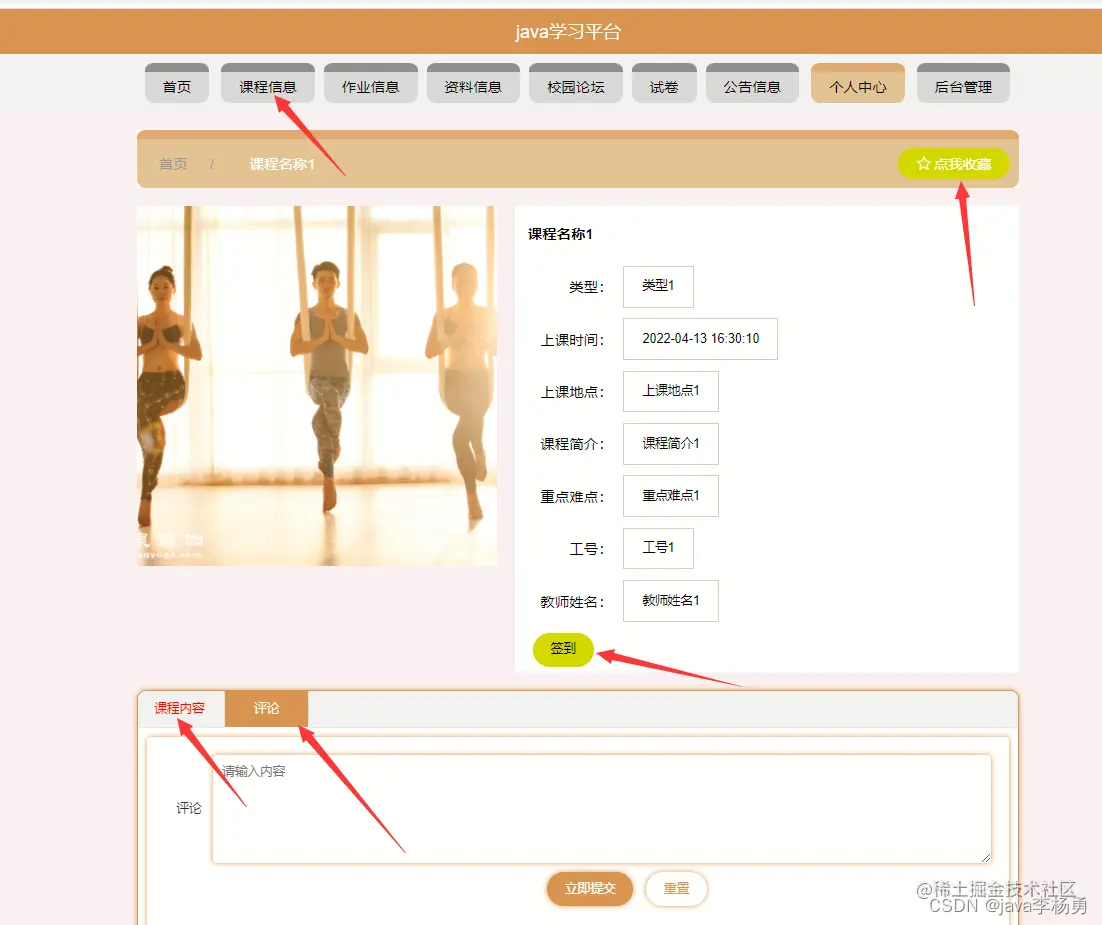 课程信息,在课程信息页面可以查看课程名称,类型,上课时间,上课地点,课程简介,重点难点,工号,教师姓名等详细内容,并进行评论和收藏操作