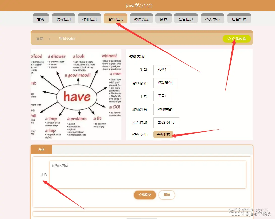 资料信息,在资料信息页面可以查看资料名称,类型,资料简介,工号,教师姓名,发布日期,资料文件等内容并进行点赞和评论操作编辑