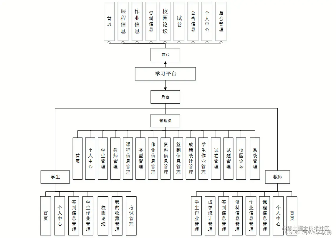 系统功能结构图是系统设计阶段,系统功能结构图只是这个阶段一个基础,整个系统的架构决定了系统的整体模式,是系统的根据。学习平台的整个设计结构如图所示。