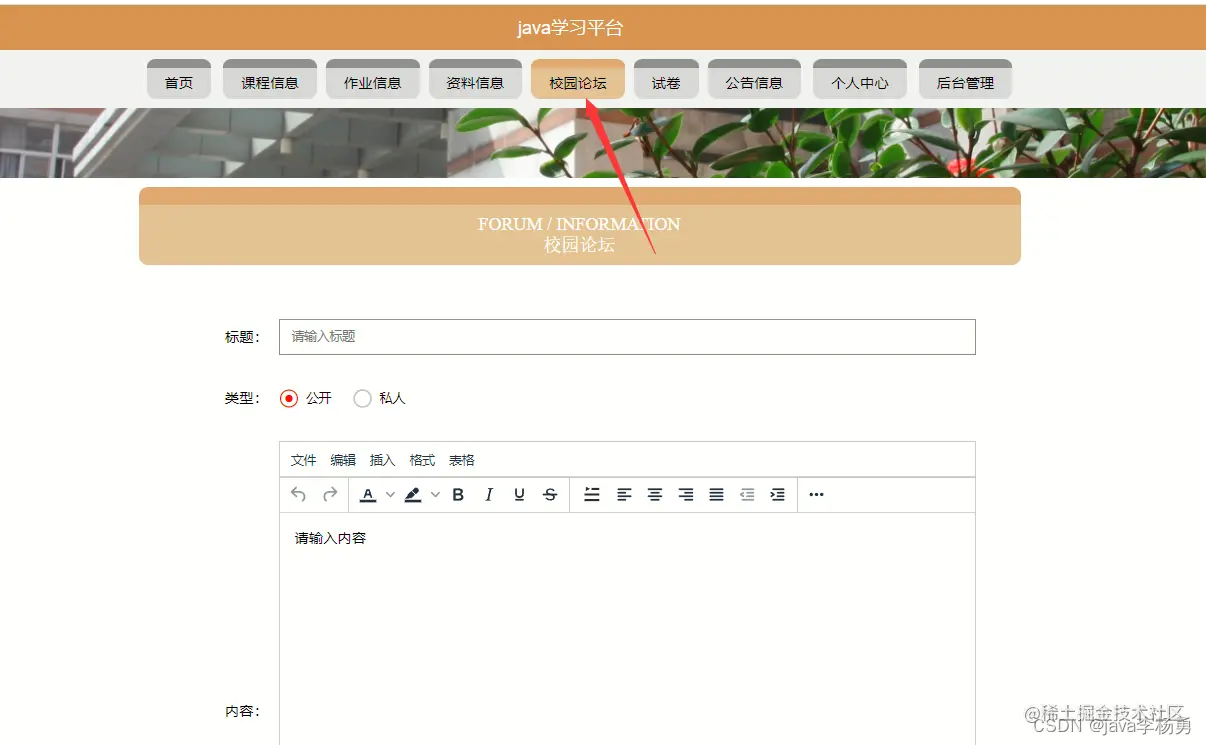 学习平台,在平台首页可以查看首页,课程信息,作业信息,资料信息,校园论坛,试卷,公告信息,个人中心,后台管理等内容进行详细操作