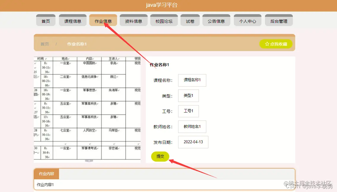作业信息,在作业信息页面可以查看作业名称,课程信息,类型,工号,教师姓名,发布日期等详细内容,并进行收藏操作