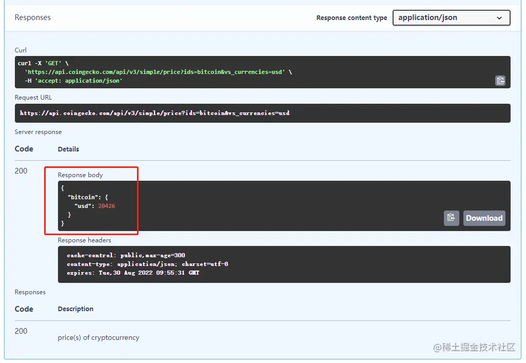 正确输入ids和vs_currencies后点击Execute即可获取到接口返回的代币价格。如下图: