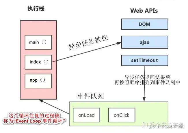 - 当程序调用外部的 API 时(比如 ajax、setTimeout 等),会将此类异步任务挂起,继续执行执行栈中的任务。等异步任务返回结果后,再按照顺序排列到事件队列中;
