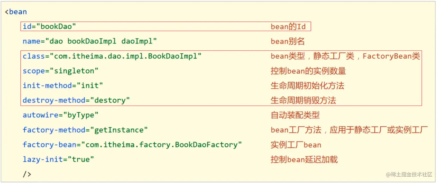 把scope、init-method、destroy-method框起来的原因是,后面注解讲解的时候还会用到,所以大家对这三个属性关注下。
