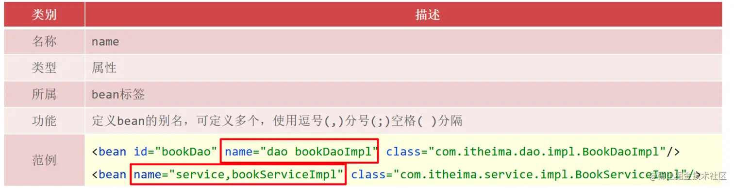<bean id="bookService" name="service service4 bookEbi" class="com.itheima.service.impl.BookServiceImpl">
