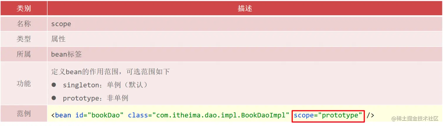 <bean id="bookDao" name="dao" class="com.itheima.dao.impl.BookDaoImpl" scope="prototype"/>