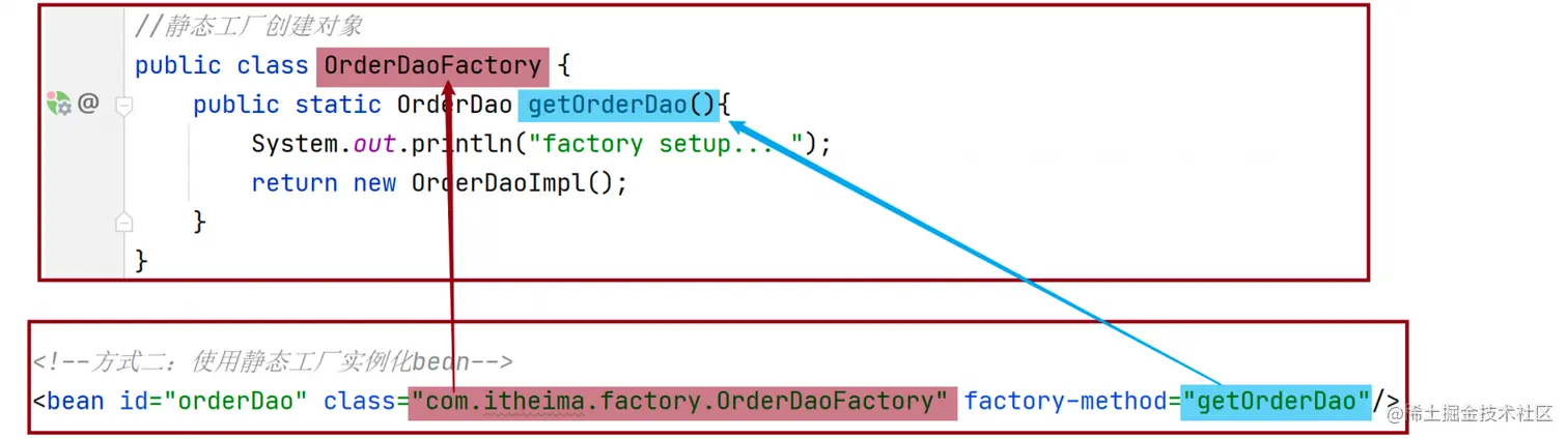 <bean id="orderDao" class="com.itheima.factory.OrderDaoFactory" factory-method="getOrderDao"/>