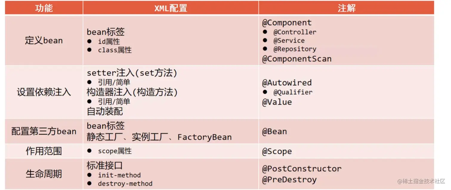 前面我们已经完成了XML配置和注解的开发实现,至于两者之间的差异,咱们放在一块去对比回顾下: