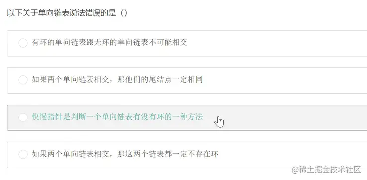 C. 快慢指针是判断单链表是否有环的一种方法:两个指针,每次移动的步长为2叫做快指针,每次移动步长为1的指针叫做慢指针。快慢指针同时从头结点出发,当快指针率先到达NULL的时候,则说明此单链表中不存在环,当快指针追上慢指针的时候,说明此单链表中存在环。