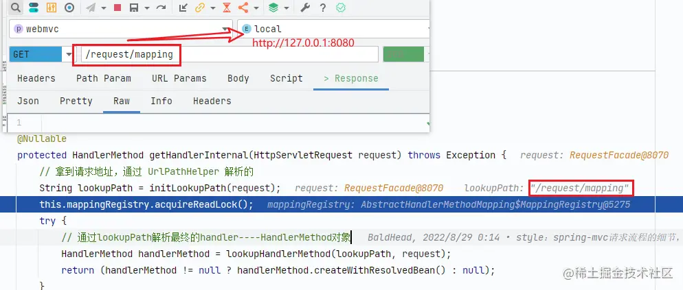 Handler,在此步骤中拿到请求地址 例如:/user/info对应方法:org.springframework.web.servlet.DispatcherServlet#getHandler - 选择合适的