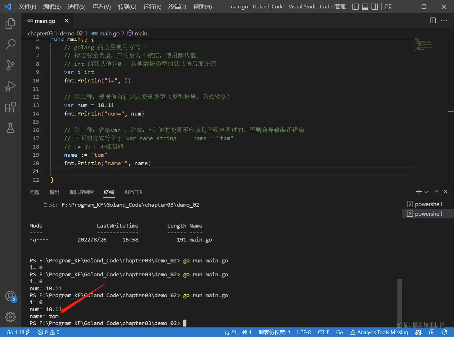 // 下面的方式等价于 var name string name = "tom"