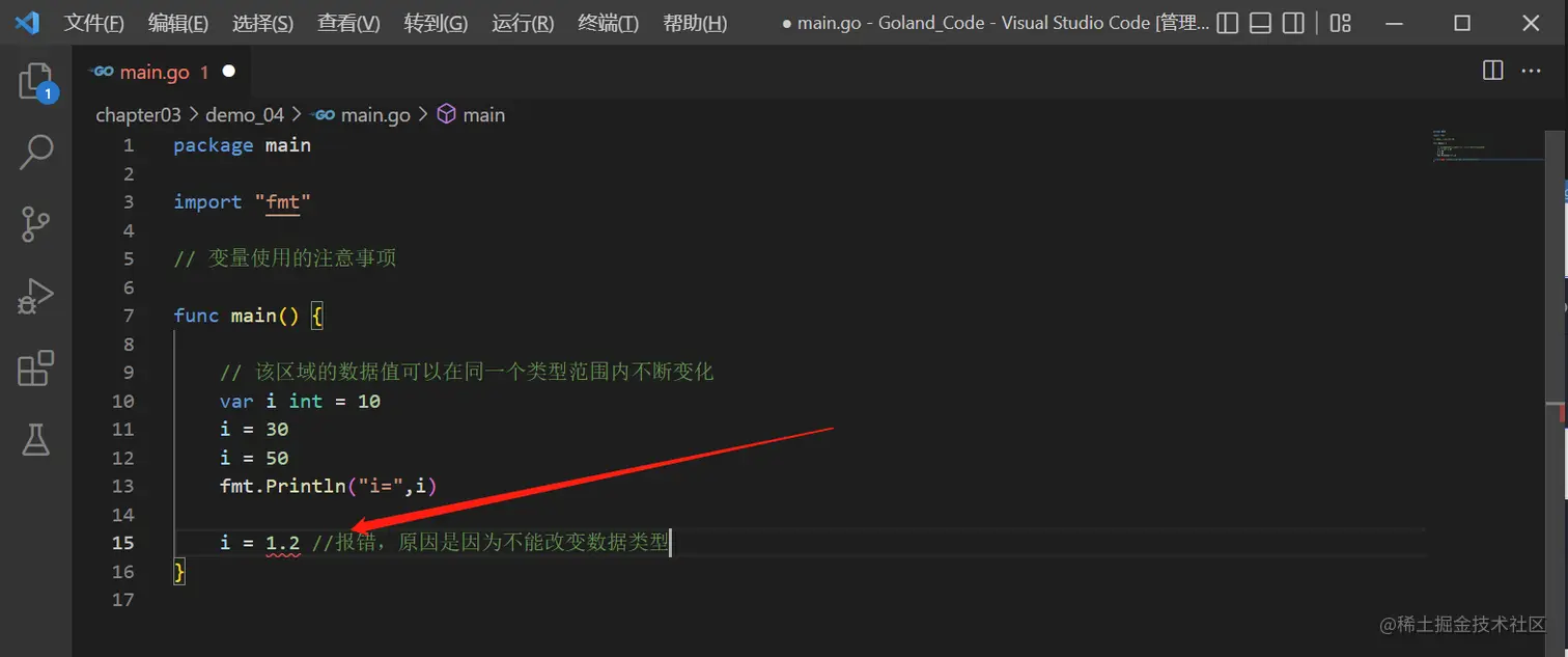 i = 1.2 //报错,原因是因为不能改变数据类型