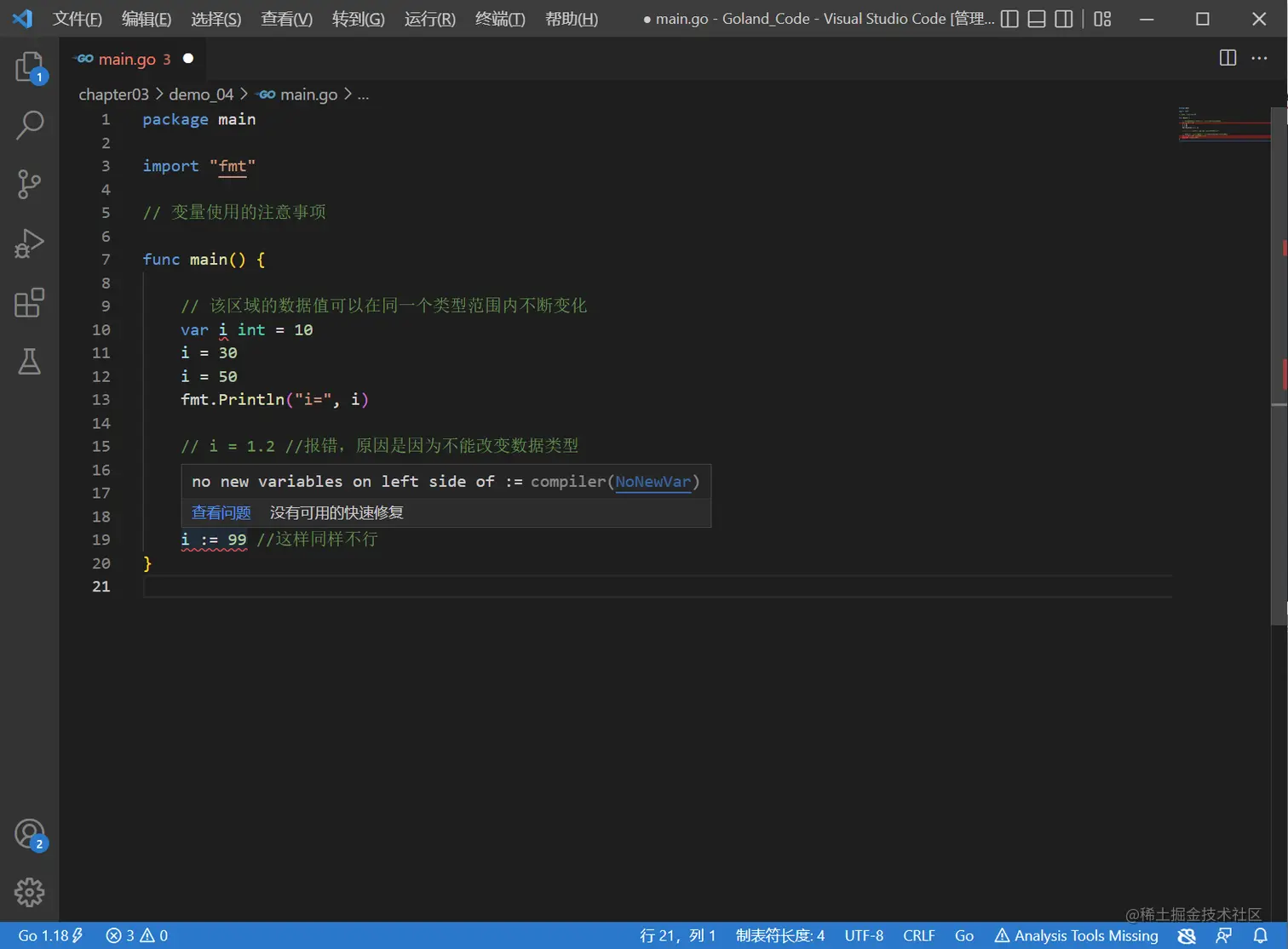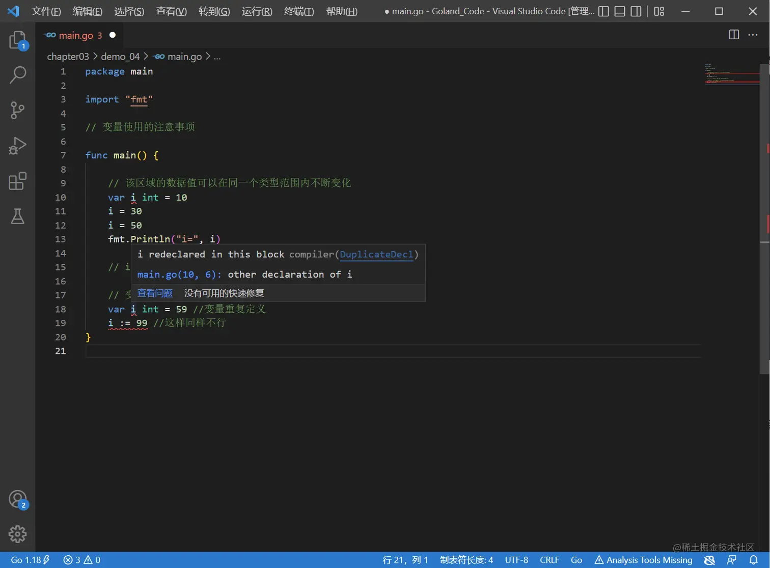 // var i int = 59 //变量重复定义
